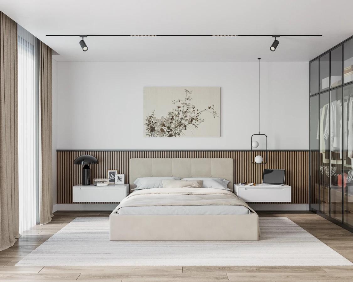 - Černá a tmavě šedá: Ačkoli to nejsou typické barvy pro ložnici, pokud jsou správně použity, mohou interiéru dodat hloubku a jistou tajemnost. Je dobré je kombinovat se světlejšími, neutrálními odstíny, aby se zabránilo přílišnému ztmavení prostoru.