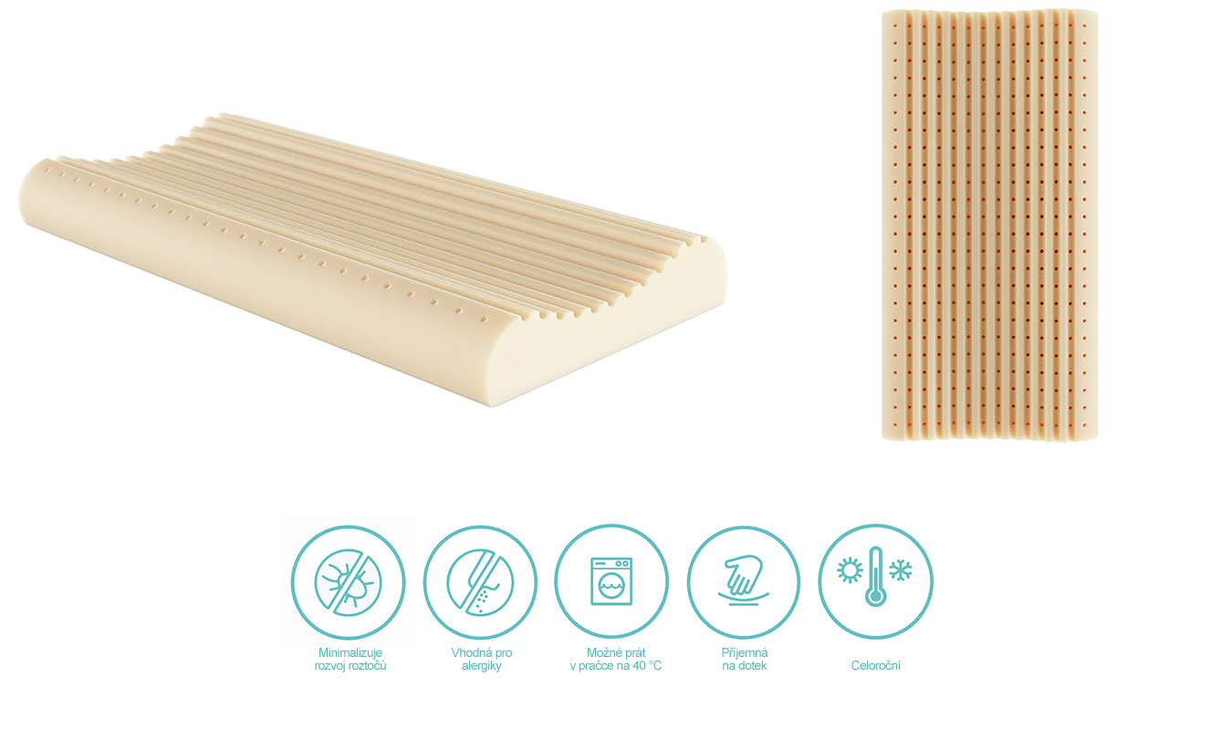 Vnitřní jádro tvoří kvalitní perforovaný latex, který se vyznačuje vysokou pružností, odolností a trvale hygienickou strukturou. Systém vzduchových kanálků zajišťuje stálou ventilaci – při každém pohybu hlavy dochází k přirozené výměně vzduchu uvnitř polštáře. Výsledkem je svěží, suché mikroklima a omezení pocení i v teplejších nocích. Latex je navíc přirozeně antialergenní, což z něj činí ideální volbu pro lidi s citlivými dýchacími cestami nebo pro alergiky.