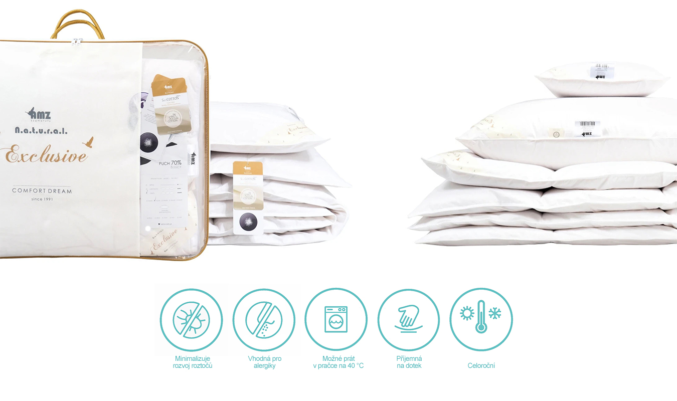Kolekce BASIC představuje ideální spojení přírodních materiálů, příjemné lehkosti a ceněného komfortu. Výrobky jsou vyplněny husím peřím 70 %, které prošlo procesem zušlechtění, díky čemuž je mimořádně čisté, nadýchané a pružné. Tento typ výplně poskytuje výbornou tepelnou izolaci, příjemnou měkkost a dlouhou životnost při každodenním používání.