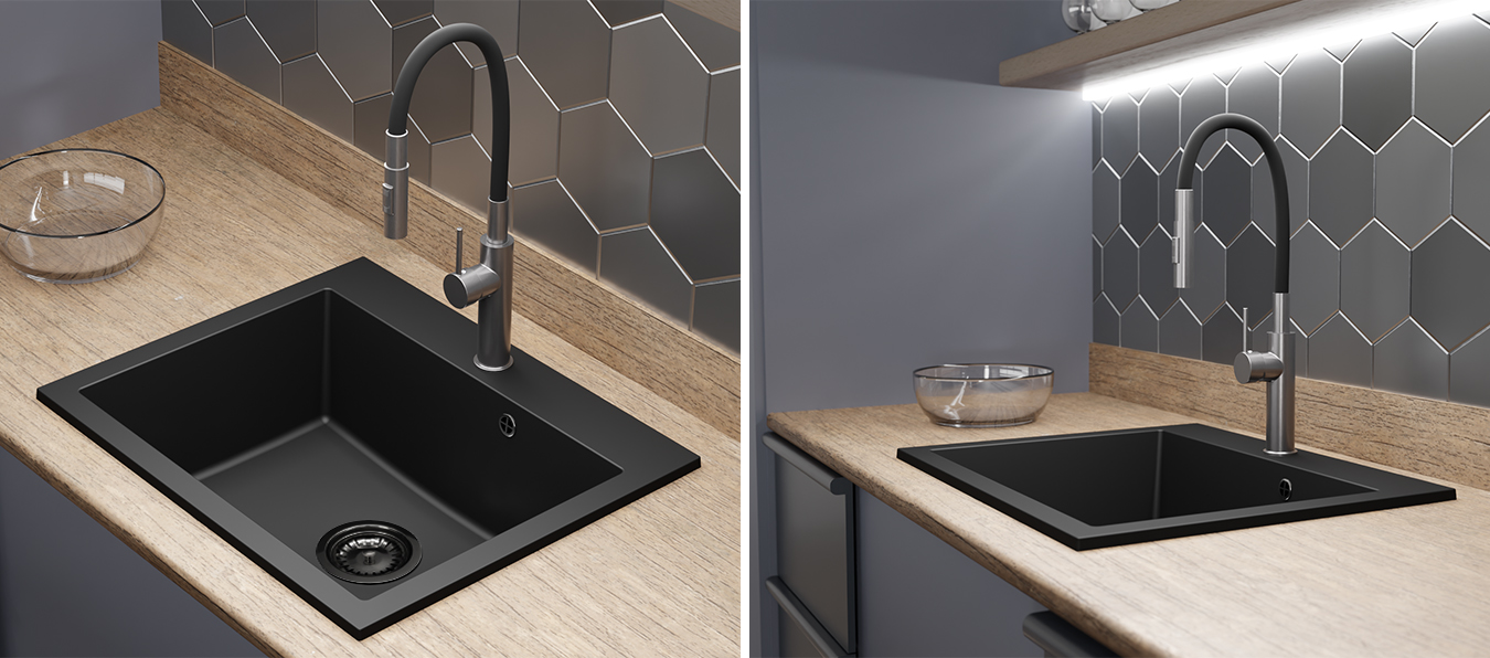 Elegantní černá barva v kombinaci s černým sifonem dodává dřezu moderní a nadčasový vzhled, který se snadno sladí s různými typy kuchyňských pracovních desek a baterií.