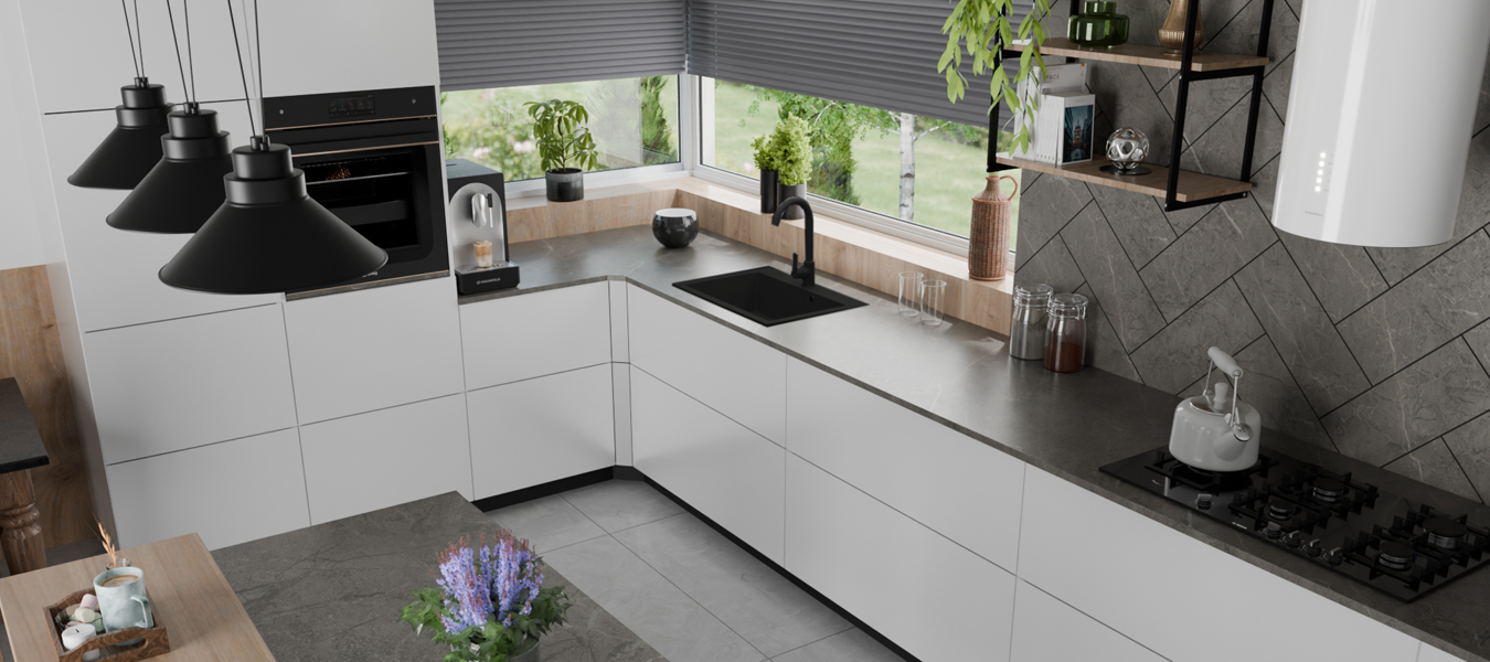 Elegantní černá barva s texturou žuly v kombinaci s černým sifonem dodává dřezu moderní a nadčasový vzhled, který se snadno sladí s různými typy kuchyňských pracovních desek a baterií.