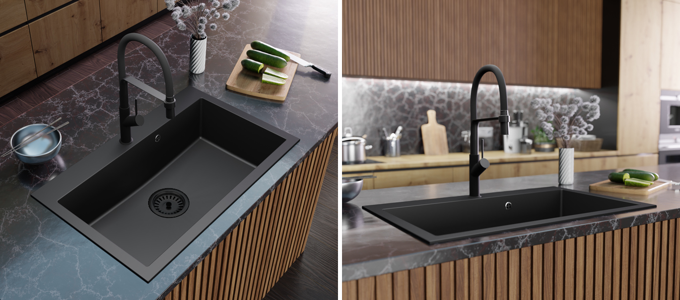 Elegantní černá barva v kombinaci s černým sifonem dodává dřezu moderní a nadčasový vzhled. Snadno jej sladíte s širokou škálou kuchyňských pracovních desek i baterií.