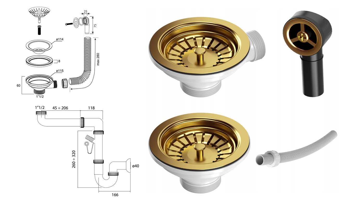 Sifon je vyroben z kombinace kvalitního PVC a nerezové oceli, což zajišťuje odolnost proti korozi, usazeninám i mechanickému poškození. Konstrukce je přístěnná, čímž šetří prostor pod dřezem a umožňuje lepší uspořádání v kuchyňské skříňce. Systém má standardní průměr odtoku 115 mm (3½") a nabízí možnost připojení myčky nebo pračky, takže plně vyhoví moderním požadavkům na komfort a funkčnost.