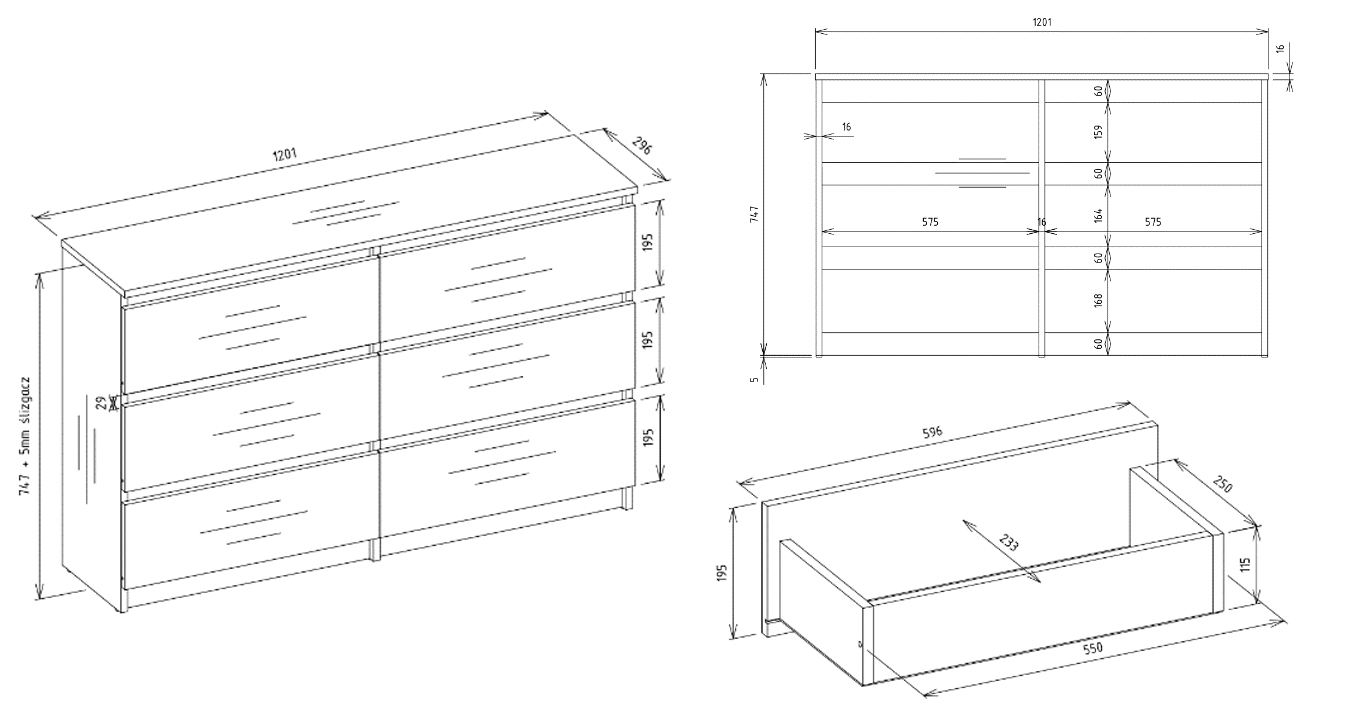 Šest prostorných zásuvek poskytuje ideální místo pro přehledné uložení oblečení, doplňků i dalších každodenních potřeb. Bezúchytkové provedení čel zásuvek podtrhuje čistý vzhled nábytku a zároveň zajišťuje pohodlné používání. Kvalitní zpracování a moderní kování přispívají k dlouhé životnosti a spolehlivosti při každodenním používání.