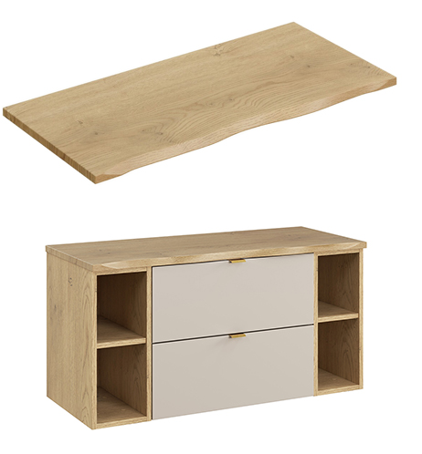 Deska NATURE CREMONA je vyrobena z odolné MDF desky s kvalitní povrchovou úpravou PVC fólií, která zajišťuje snadnou údržbu a dlouhou životnost. Její jemně zvlněná hrana imituje ručně řezané dřevo, díky čemuž vnáší do koupelny autentický, přírodní a útulný vzhled. Deska je navržena tak, aby perfektně ladila se skříňkami z kolekcí DALIA CASHMER, NORDIC CREMONA a regály v dekoru dub cremona, čímž vytváří harmonický a stylový celek. Pro instalaci umyvadla je nutné vyříznout otvor pro sifon dle rozměrů a umístění umyvadla. Produkt vznikl z ekologicky certifikovaných materiálů FSC, což podporuje dlouhou životnost, kvalitu a udržitelnost. Povrch desky je odolný proti běžnému opotřebení a snadno se čistí, což zajišťuje komfortní a dlouhodobé používání. Každá deska je pečlivě zpracována s důrazem na detail a precizní provedení.