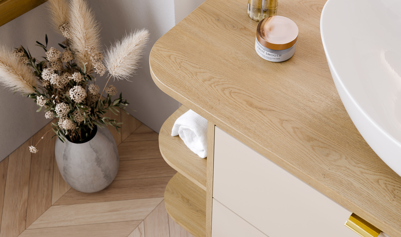Deska OVALIA CREMONA je vyrobena z odolné MDF desky, která zajišťuje snadnou údržbu, stabilitu a dlouhou životnost. Její jemně zaoblené rohy dodávají celé konstrukci elegantní vzhled a optickou lehkost, zatímco dekor Dub Cremona věrně napodobuje strukturu přírodního dřeva a přináší do koupelny teplý, příjemný charakter. Deska je navržena tak, aby dokonale ladila se skříňkami z kolekce OVALIA CREMONA nebo DALIA CASHMERE a dalšími prvky v dekoru Dub Cremona, čímž vytváří harmonický a moderní celek. Pro instalaci umyvadla je nutné vyříznout otvor pro sifon dle rozměrů a umístění umyvadla. Produkt vznikl z ekologicky certifikovaných materiálů FSC, které zaručují kvalitu, dlouhou životnost a šetrnost k životnímu prostředí. Povrch desky je odolný vůči vlhkosti i běžnému opotřebení a snadno se čistí, což zajišťuje komfortní a dlouhodobé používání. Každá deska je precizně zpracována s důrazem na detail a estetickou čistotu provedení.