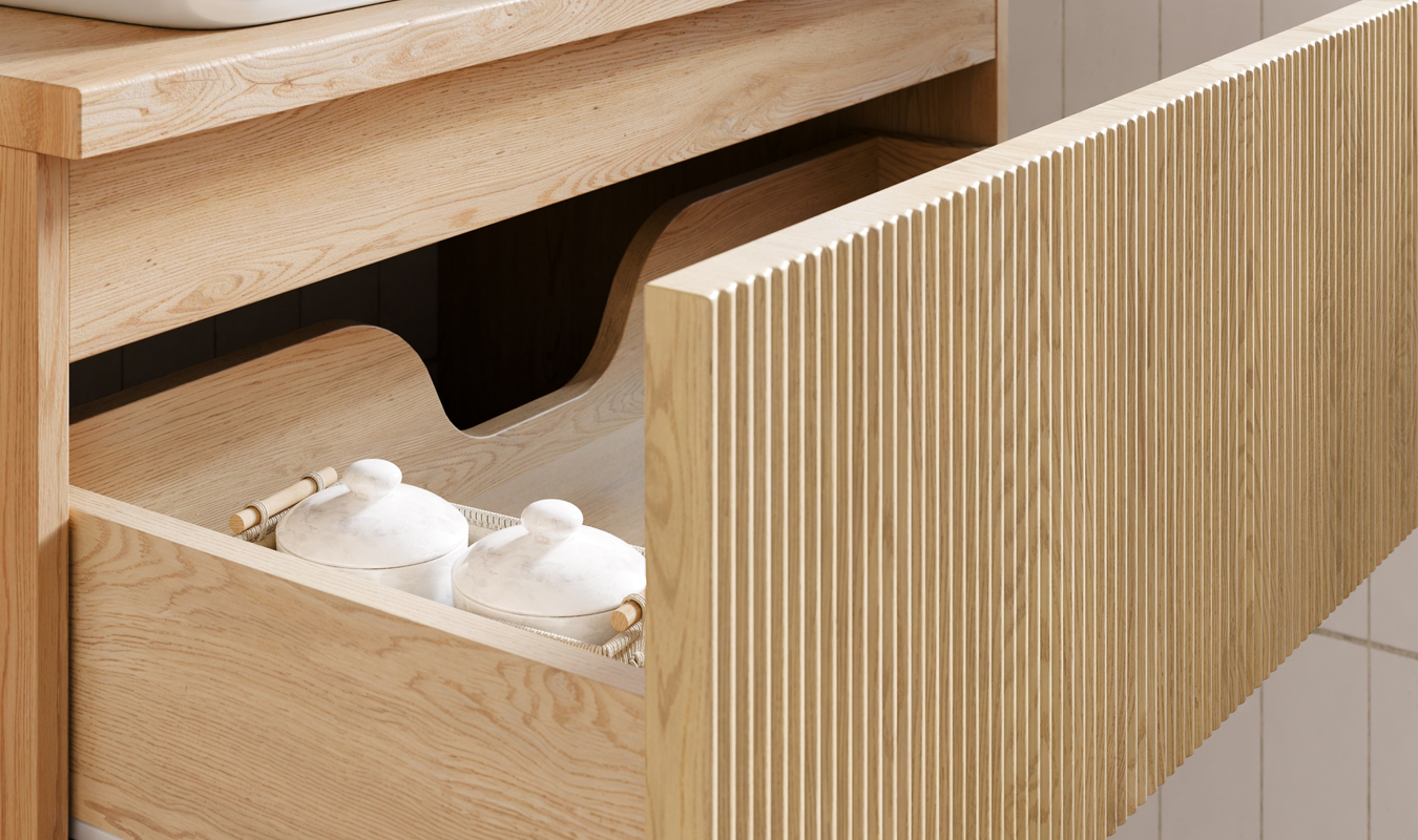 Závěsná skříňka pod umyvadlo o šířce 80 cm je promyšleně navržená tak, aby nabídla dostatek úložného prostoru a zároveň působila esteticky čistě a moderně. Dvě hluboké zásuvky s tichým dovíráním umožňují pohodlné uložení kosmetiky, ručníků či čisticích prostředků, takže vše potřebné máte vždy po ruce.