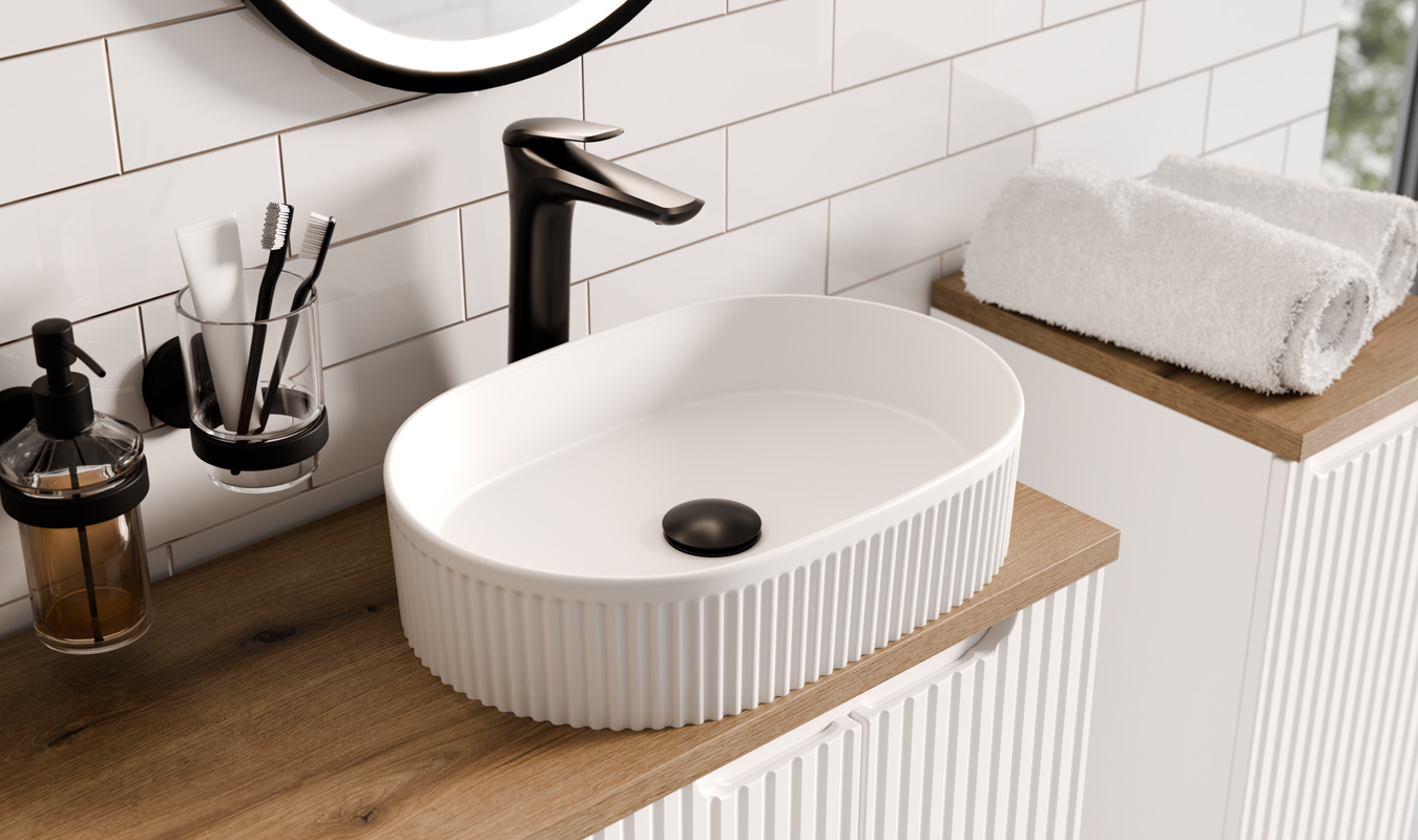 Komfortní umyvadlo Beyond 3 zaujme svým elegantním tvarem a matně bílým povrchem, který dodává koupelně výrazný, moderní a sofistikovaný vzhled. Jemné vertikální rýhování po obvodu umyvadla podtrhuje jeho originální design a přináší do interiéru luxusní detail. Díky svým rozměrům poskytuje dostatek prostoru, aniž by působilo mohutně.