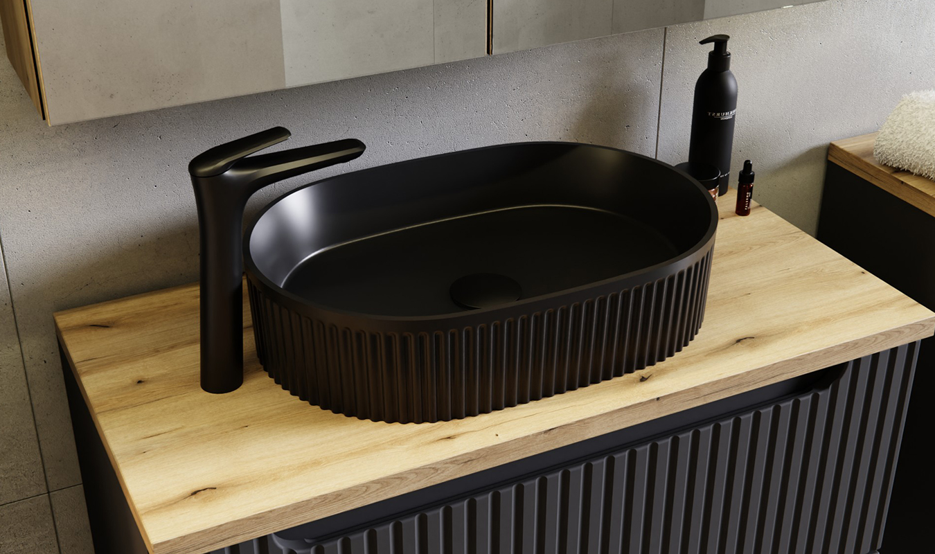 Komfortní umyvadlo Beyond 5 zaujme svým elegantním tvarem a matně černým povrchem, který dodává koupelně výrazný, moderní a sofistikovaný vzhled. Jemné vertikální rýhování po obvodu umyvadla podtrhuje jeho originální design a přináší do interiéru luxusní detail. Díky kompaktním rozměrům 48×32,5 cm poskytuje umyvadlo dostatek prostoru pro každodenní používání, aniž by působilo mohutně.