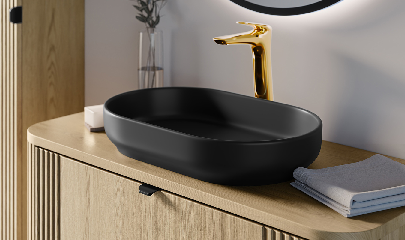 Komfortní umyvadlo River zaujme svým matným povrchem v elegantním černém odstínu a oválnou formou, která dodává koupelně výrazný a moderní styl. Nabízí dostatek prostoru pro každodenní používání, aniž by působilo mohutně nebo zabíralo příliš místa.