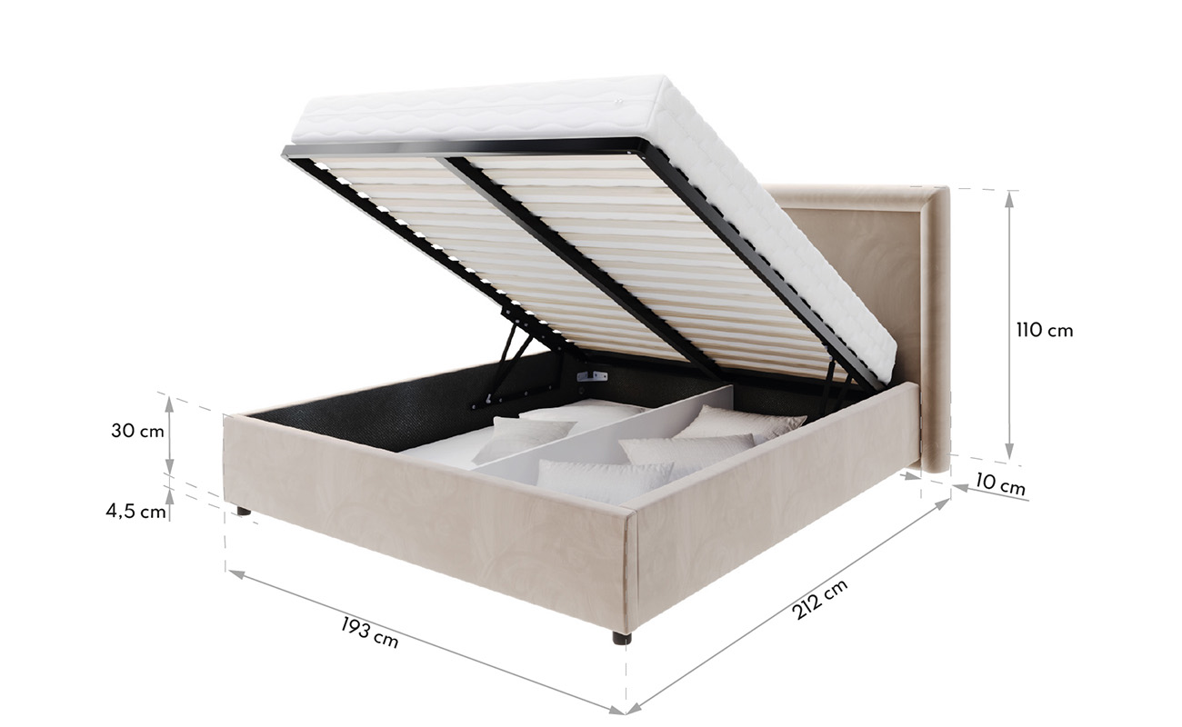 Postel NOBILE je vybavena pevným lamelovým roštem, který poskytuje stabilní oporu matraci a zároveň zajišťuje její optimální odvětrávání. Pružné lamely se přizpůsobují zatížení a reagují na pohyb těla, čímž přispívají k maximálnímu pohodlí během spánku. Součástí postele je také prostorný úložný prostor, ideální pro ložní prádlo, sezónní oblečení nebo další věci, které chcete mít přehledně uložené. Díky výklopnému roštu s plynovými písty je přístup do úložného prostoru snadný a pohodlný. Dno úložného boxu dosahuje až k podlaze, takže bez obav unese i těžší předměty.