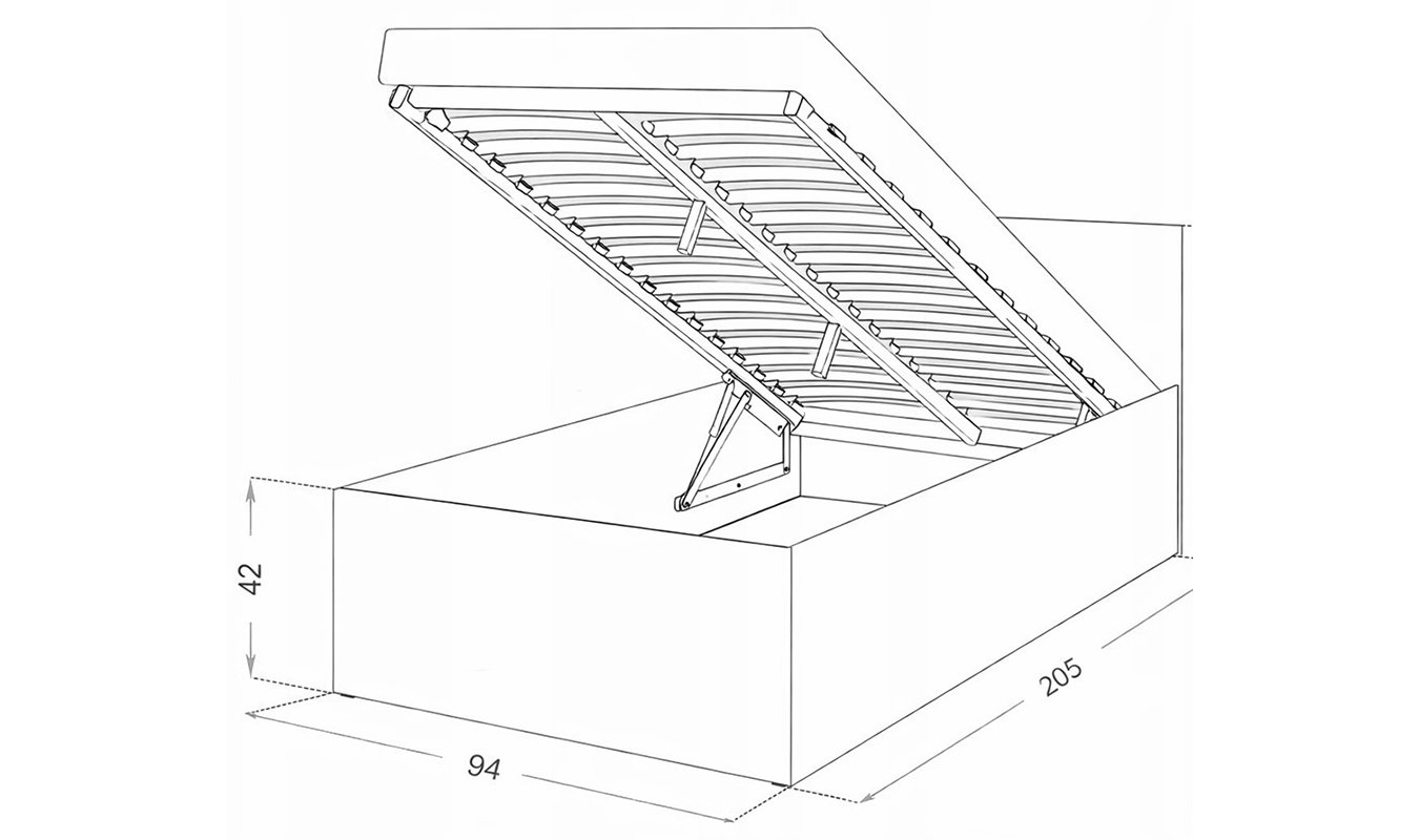 Vnější rozměry postele jsou 94 × 205 cm a ložná plocha 90 × 200 cm.