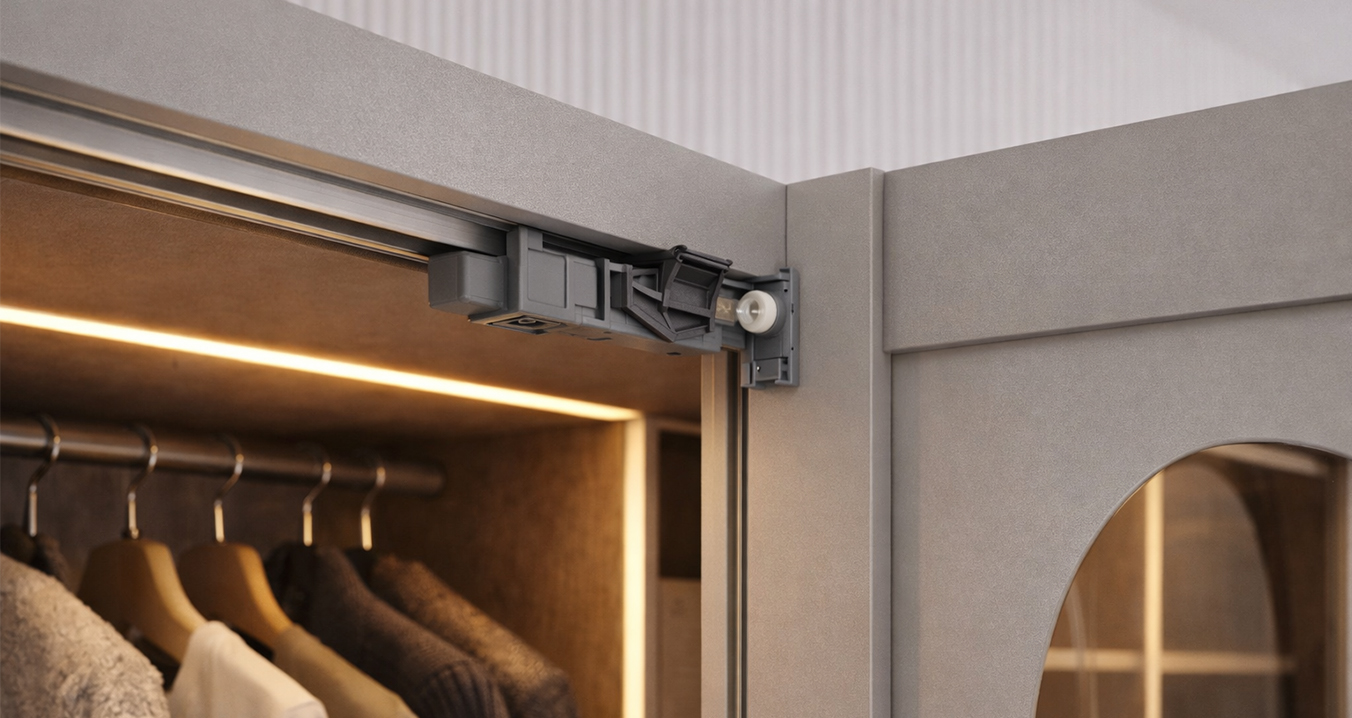 Samozavírací mechanismus pro posuvné dveře šatních skříní zajišťuje plynulé, tiché a bezpečné dovírání. Chrání dveře i konstrukci skříně před nárazy a zvyšuje komfort každodenního používání.
