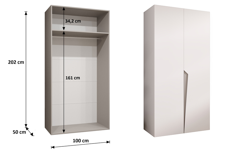 Čelní plochu skříně tvoří dvoje otevírací dveře vybavené tlumeným dovíracím systémem, který zajišťuje plynulé a tiché zavírání. Vnitřní prostor zahrnuje praktické police i šatní část s věšákovou tyčí, což umožňuje pohodlné ukládání jak složeného, tak zavěšeného oblečení.