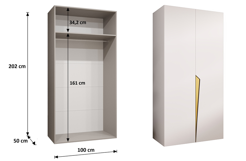 Skříň PIANO je dostupná v moderních barevných provedeních, včetně elegantní bílé, doplněné stylovými úchyty ve zlatém provedení. Nabídka rozměru umožňuje snadno zvolit variantu, která perfektně doplní váš interiér a poskytne dostatek úložného prostoru.