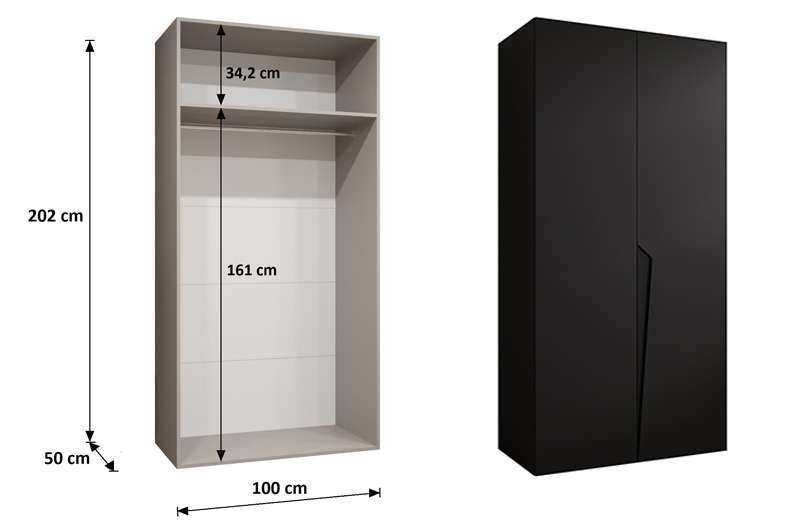 Čelní plochu skříně tvoří dvoje otevírací dveře vybavené tlumeným dovíracím systémem, který zajišťuje plynulé a tiché zavírání. Vnitřní prostor zahrnuje praktickou polici i šatní část s věšákovou tyčí, což umožňuje pohodlné ukládání jak složeného, tak zavěšeného oblečení.