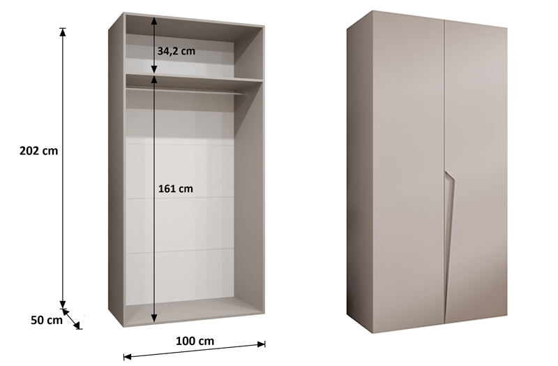Čelní plochu skříně tvoří dvoje otevírací dveře vybavené tlumeným dovíracím systémem, který zajišťuje plynulé a tiché zavírání. Vnitřní prostor zahrnuje praktickou polici i šatní část s věšákovou tyčí, což umožňuje pohodlné ukládání jak složeného, tak zavěšeného oblečení.